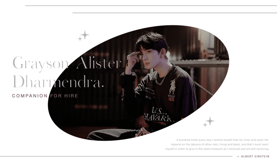 ⠀⠀⠀⠀Salute! Kemilau gemintang memancarkan cahayanya pada setiap inci permukaan bumi untuk pertama kalinya akan memperkenalkan seorang pria bernama Grayson Alister Dharmendra. Biasa dipanggil dengan sebutan Alister atau Al untuk lebih singkatnya. Namanya memiliki arti tersendiri dari setiap kata. Grayson berarti Anak laki-laki, Alister berarti Penjaga dan Penolong dan Dharmendra berarti Keberkahan Tuhan. Jika disatukan akan menjadi kalimat "Seorang anak laki-laki penjaga dan penolong yang merupakan Keberkahan dari Tuhan."⠀⠀⠀⠀Banyak dari teman-temannya berkata bahwa pria ini mempunyai sisi Cold City Namja atau disingkat dengan CCN dan mempunyai vibes Tsundere tetapi tetap memiliki sisi hangat, penyayang dan sering kali menjahili orang-orang disekitarnya. Pria satu ini mempunyai tipikal love—hate dalam relationship dengan seseorang yang dia sayangi dan dia cintai, singkatnya kepada sang kekasih. Walaupun begitu, dia tetap akan memperlakukan kekasihnya dengan lembut seperti seorang Ratu. Pria ini juga mempunyai sisi manja dan clingy pada kekasihnya, terkadang dia bertindak layaknya seperti anak—anak ketika sedang bermanja kepada kekasihnya dan akan mengirim foto dan gif Face Claim yang dia pakai atau stiker lucu dan menggemaskan untuk merayu sang kekasih dengan manja.⠀⠀⠀⠀Pria ini pun aktif dalam berbicara dan pintar dalam membangun suatu percakapan. Selain itu, dia mempunyai karakter pendengar yang baik walau mempunyai sifat kekanak—kanakan dia juga sangat dewasa jika dihadapkan dengan hal—hal yang harus dipikirkan dengan matang oleh sifat dewasanya yang terpendam. Dia sering sekali dicari oleh beberapa orang hanya untuk diajak bercerita, mengutarakan curahan hati, sharing berbagai macam hal dan mengobrol secara acak bahkan hanya sekedar untuk TMI sekalipun. Pria ini mempunyai karakter fleksibel yang membuatnya mudah berbaur dalam banyak situasi dan juga dengan beberapa orang disekitarnya.⠀⠀⠀⠀Tak lupa, pria ini mempunyai suatu hal yang dia sukai sedari masih kecil. Perlu diketahui, dia adalah seorang WIBU, yaitu seseorang yang menyukai AniManga dan dia juga seorang MCU, yaitu seseorang yang menyukai beberapa series dan juga film dalam Marvel Studio, terutama series film AVENGERS yang sangat menarik terutama dalam bidang Teknologi terbarunya. Tokoh AniManga yang dia sukai yaitu, Itachi Uchiha, Baji Keisuke, dan juga Conan Edogawa. Masing—masing tokoh tersebut mempunya karakter yang menarik hati pria WIBU ini. Dan juga, pria ini sering membaca Manga melalui Aplikasi atau Web. Untuk tokoh dalam Marvel yang dia sukai yaitu, Thor, Iron Man dan Spiderman. Selain itu ada beberapa genre film yang dia sukai, seperti Thriller, Action, Supranatural, Fantasy, Romance dan Comedy. Dan lagi, dia senang mendengarkan music pada aplikasi Spotify, terutama list lagu Barat dari Avril Lavigne, Justin Bieber, Taylor Swift, Westlife, Celine Dion, dan Ariana Grande. Untuk list lagu Indonesia sendiri yaitu, Peterpan (Noah), Reza Darmawangsa, Tiara Andini, Bunga Citra Lestari (BCL) dan Rizky Febian. Tak lupa menyukai banyak Sound Track Jepang yang dipakai sebagai OST dari beberapa anime yang pernah dia tonton.⠀⠀⠀⠀Selain itu, dia juga seorang FanBoy dari beberapa group KPOP, diantaranya ENHYPEN, TXT, BTS, Red Velvet, IVE dan Lesserafim. Untuk beberapa fc yang akan dia ambil sebagai Face Claim pun berada diantara group tersebut. Oleh karena itu, pria ini pun menjadi seorang pembaca AU dan juga Wattpad sejak menyukai hal-hal tentang KPOP. Tapi, dia juga menyukai satu judul Webtoon yang dia baca dan selalu ditunggu chapter terbarunya. Webtoon tersebut berjudul DARK MOON yang menceritakan tentang ENHYPEN dan diterbitkan oleh HYBE ENTERTAINMENT. Namun, dia juga menyukai beberapa Aktor Thailand, seperti Bright Vachirawit dan Dew Jirawat. Lalu, ada juga beberapa Aktris Thailand yang dia sukai, seperti contohnya, Tu Tontawan dan Prim Chanikarn. Terbilang, pria ini baru saja mengikuti hal—hal dari Thailand dan baru saja menonton series Together (BrightWin), F4 Thailand dan Girl From Nowhere.